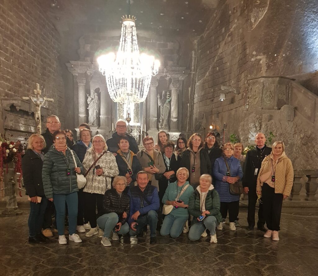 Uczestnicy wycieczki mogli zwiedzić kopalnię soli w Wieliczce. Kopalnia to wyjątkowy zabytek, wpisany na listę UNESCO z imponującymi korytarzami, podziemnymi jeziorami, komorami i kaplicami. W najpiękniejszej, wspaniale zdobionej kaplicy, zlożone są relikwie św. Kingi. Zwiedzanie odbywalo się w dwóch mniejszych grupach.